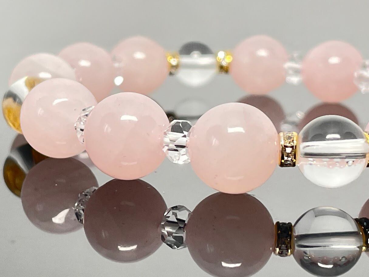 「愛と幸福の石」と称される ローズクォーツ(10mm珠) を使用した特別なブレスレットです。恋愛運や良縁を向上させる力を持ち、持ち主の心に優しく寄り添うことで、幸福な未来を引き寄せるとされています。ポイントにはクリスタルクォーツ(水晶 8mm)を使用し、心身を浄化するエネルギーもプラスされています。