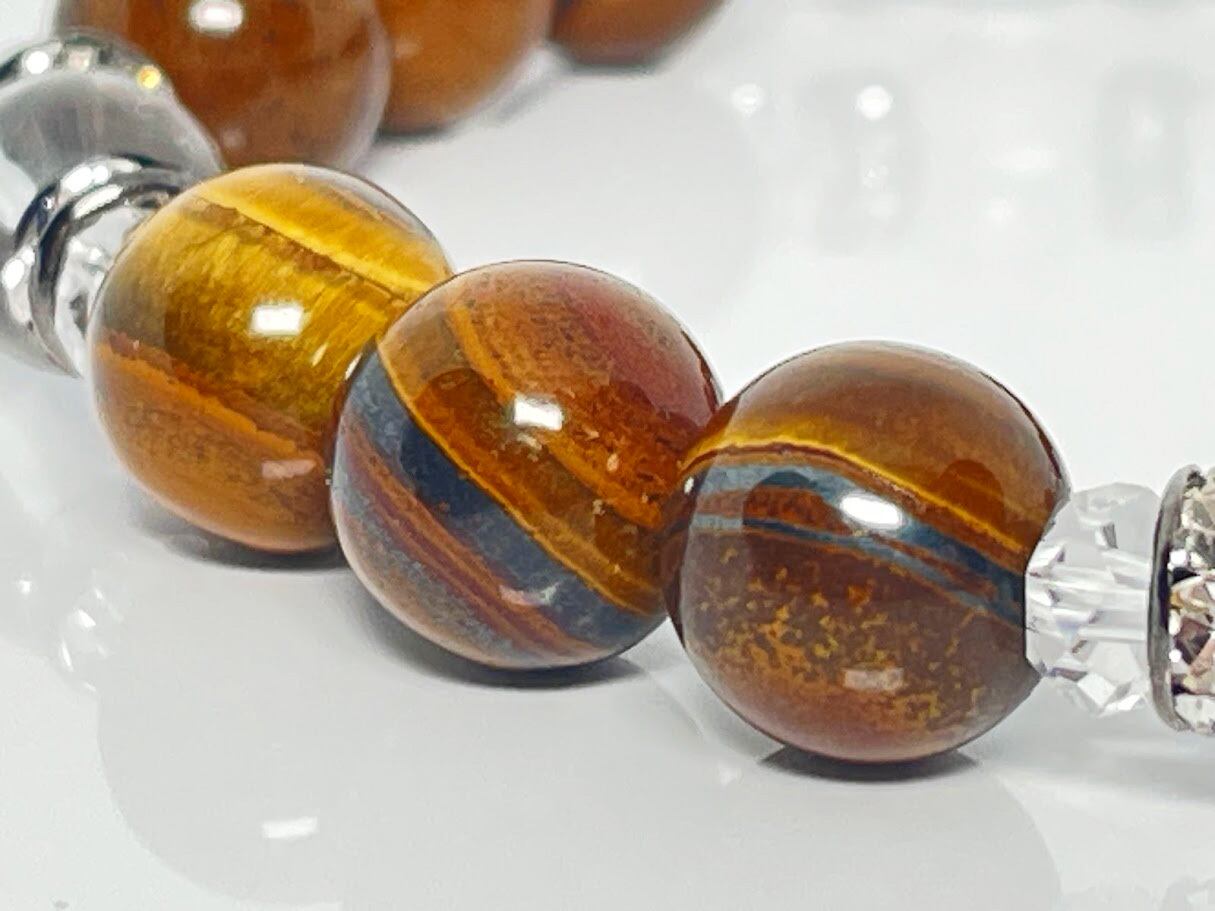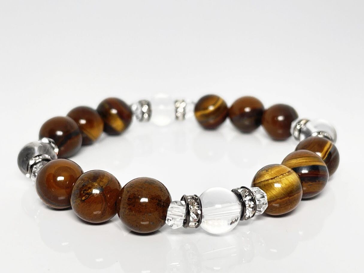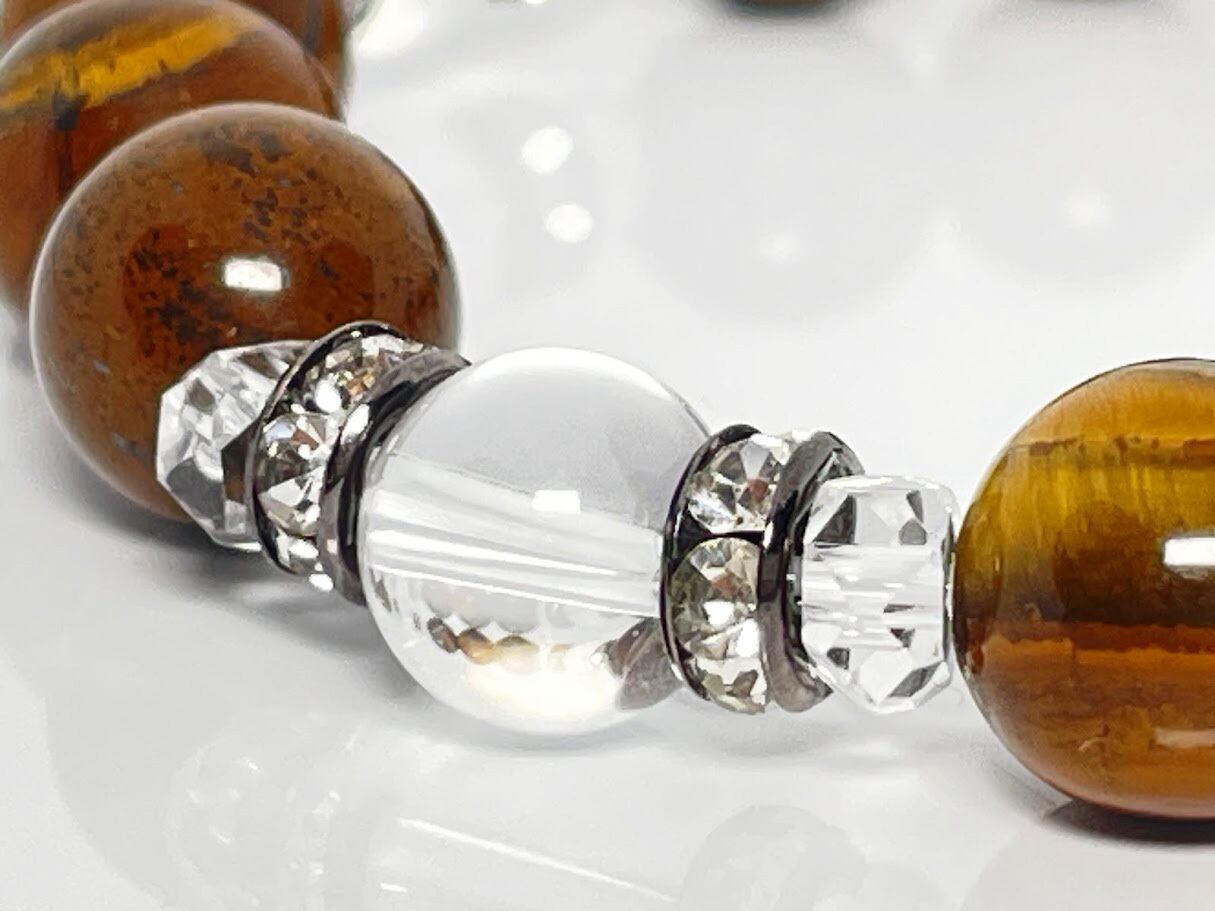 「運を呼び込む特別なパートナー」タイガーアイ(10mm)と水晶(8mm)を使用した、魅力あふれるブレスレットです。タイガーアイは金運・財運・仕事運を向上させる石として多くの方に親しまれています。この石の美しい金色の縞模様が、持ち主に活力と自信を与え、目標達成をサポートします。