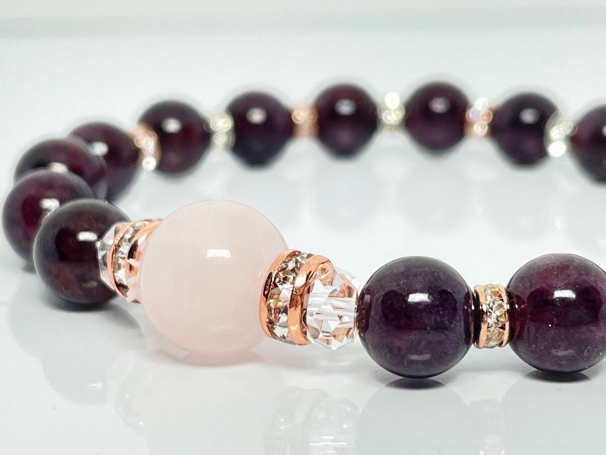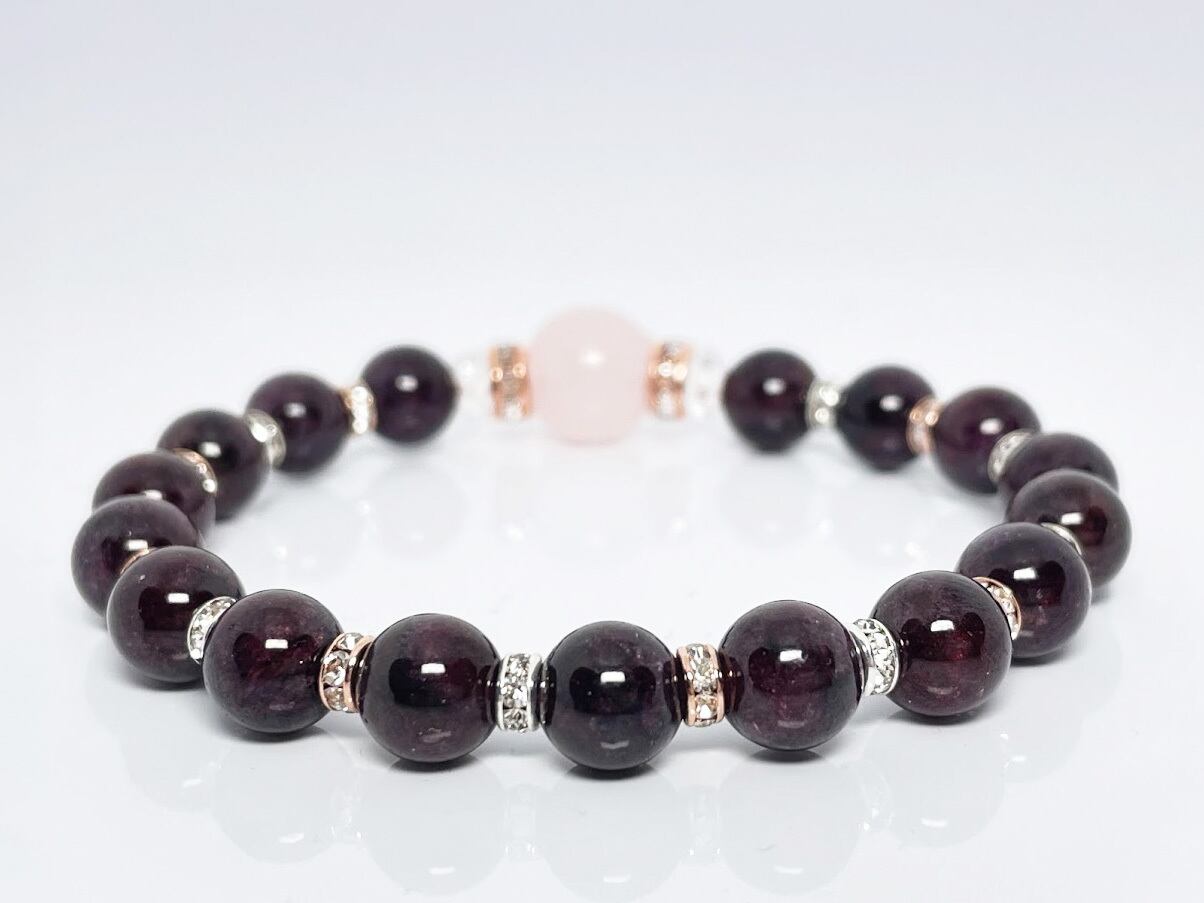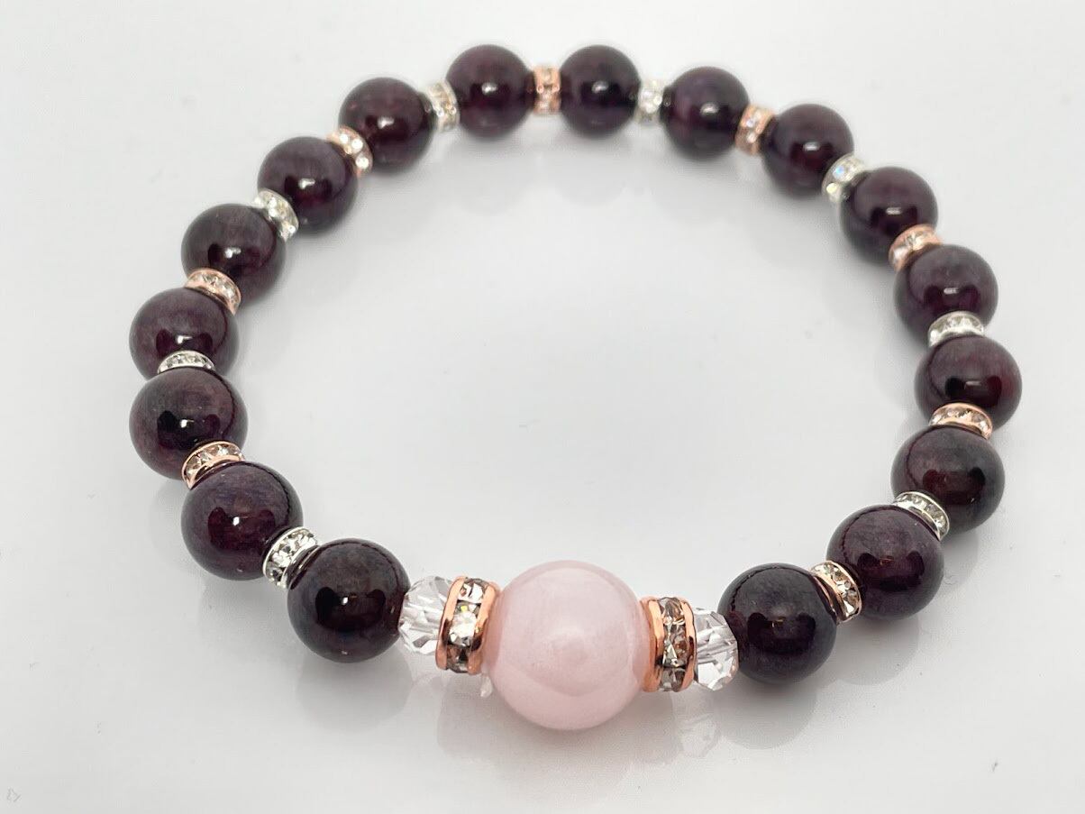成功と努力の象徴である ガーネット(8mm珠) を贅沢に使用し、ワンポイントに ローズクォーツ(10mm珠) をあしらったブレスレットです。ガーネットは「金運・財運・仕事運」を高め、努力を実らせる石として知られています。さらに、ローズクォーツは「恋愛運・良縁」を引き寄せるとされ、愛と優しさをもたらしてくれるでしょう。